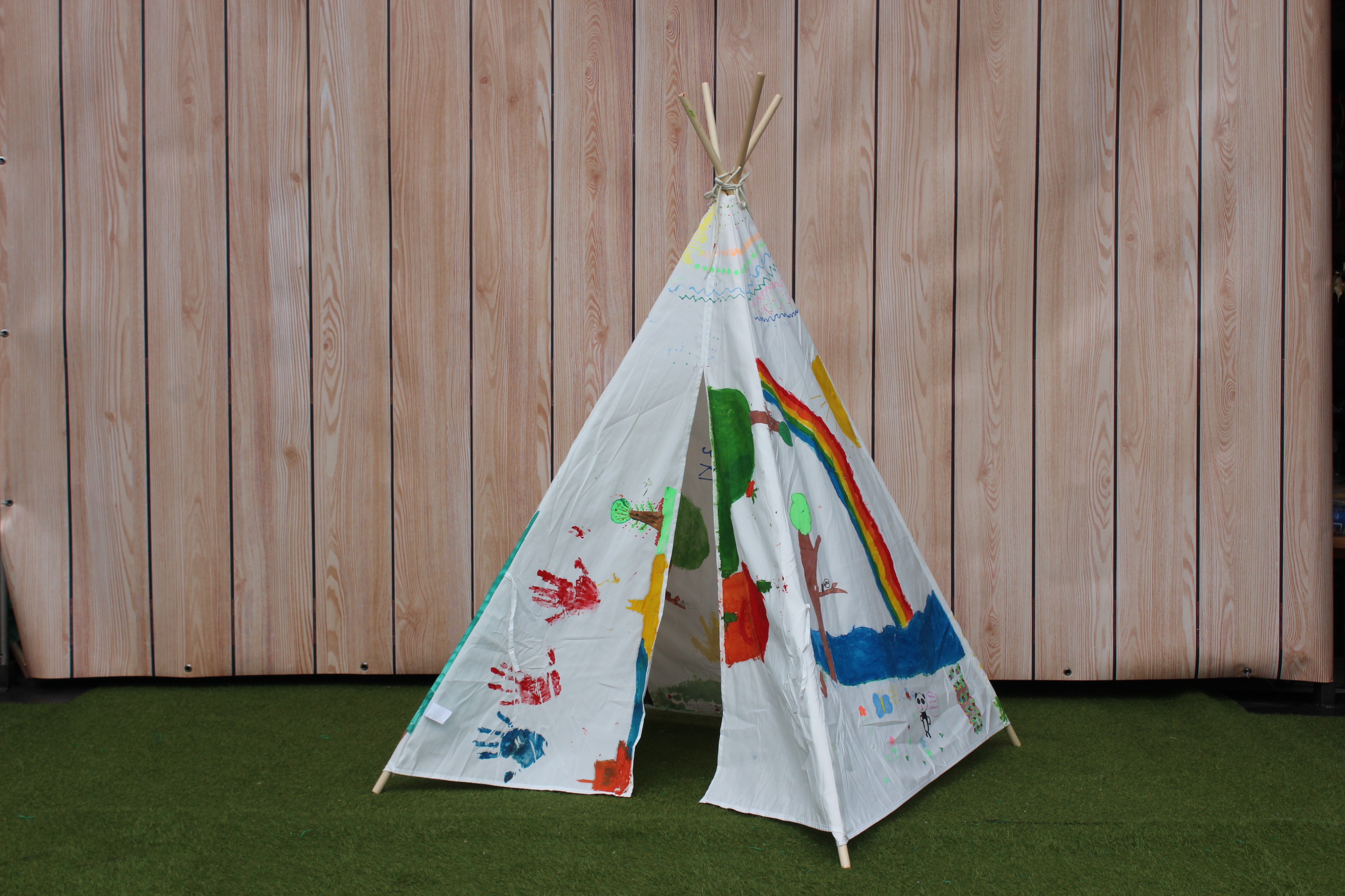 Ich bin das bunte Frühlings-Tipi. Ich komme von weit her – viele Kinder haben mich bemalt, das gefällt nur sehr.
